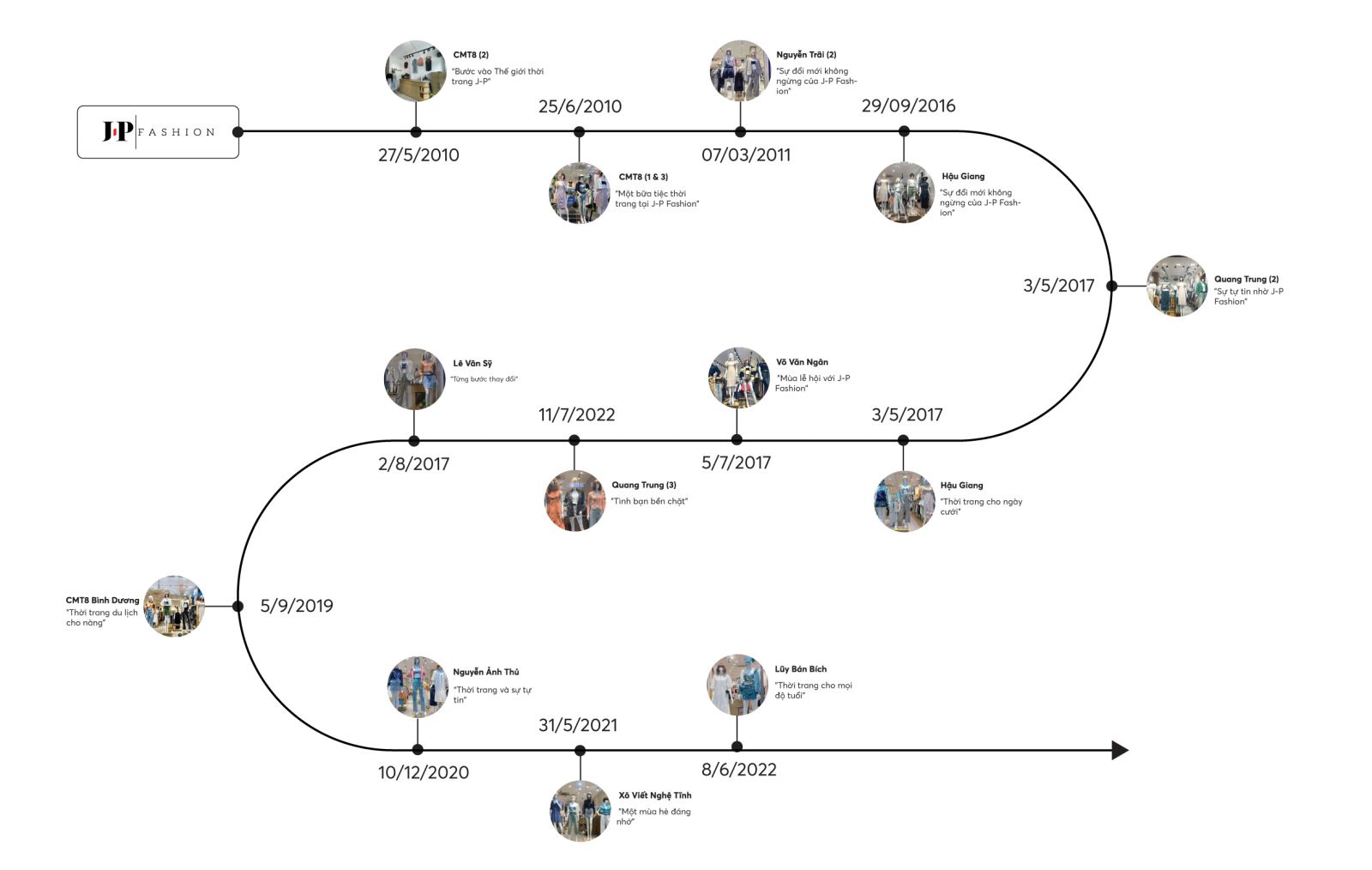 Khởi điểm từ một cửa hàng nhỏ lẻ tại TP. HCM năm 2003, đến nay đã hơn 20 năm, với hai nhà máy may tại quận Tân Bình và Hóc Môn - TP. HCM và 13 cửa hàng tại hầu hết con phố sầm uất TP. HCM, đồng thời, phát triển sâu rộng kênh bán trên website, Instagram. J-P Fashion đang phát triển lớn mạnh từng ngày, khẳng định được vị thế trên thị trường, trở thành 1 trong những chuỗi cửa hàng thời trang hàng đầu ở Việt Nam.